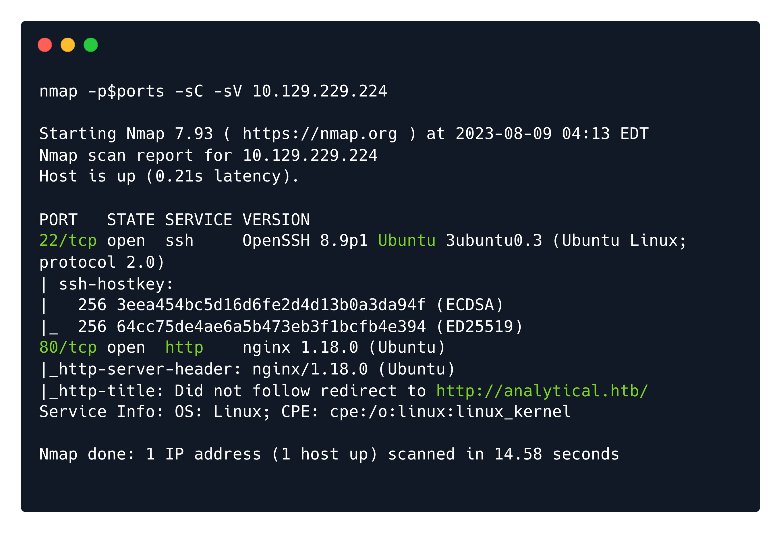 ports=$(nmap -p- --min-rate=1000 -T4 10.129.229.224 | grep '^[0-9]' | cut -d '/' -f 1 | tr '\n' ',' | sed s/,$//)