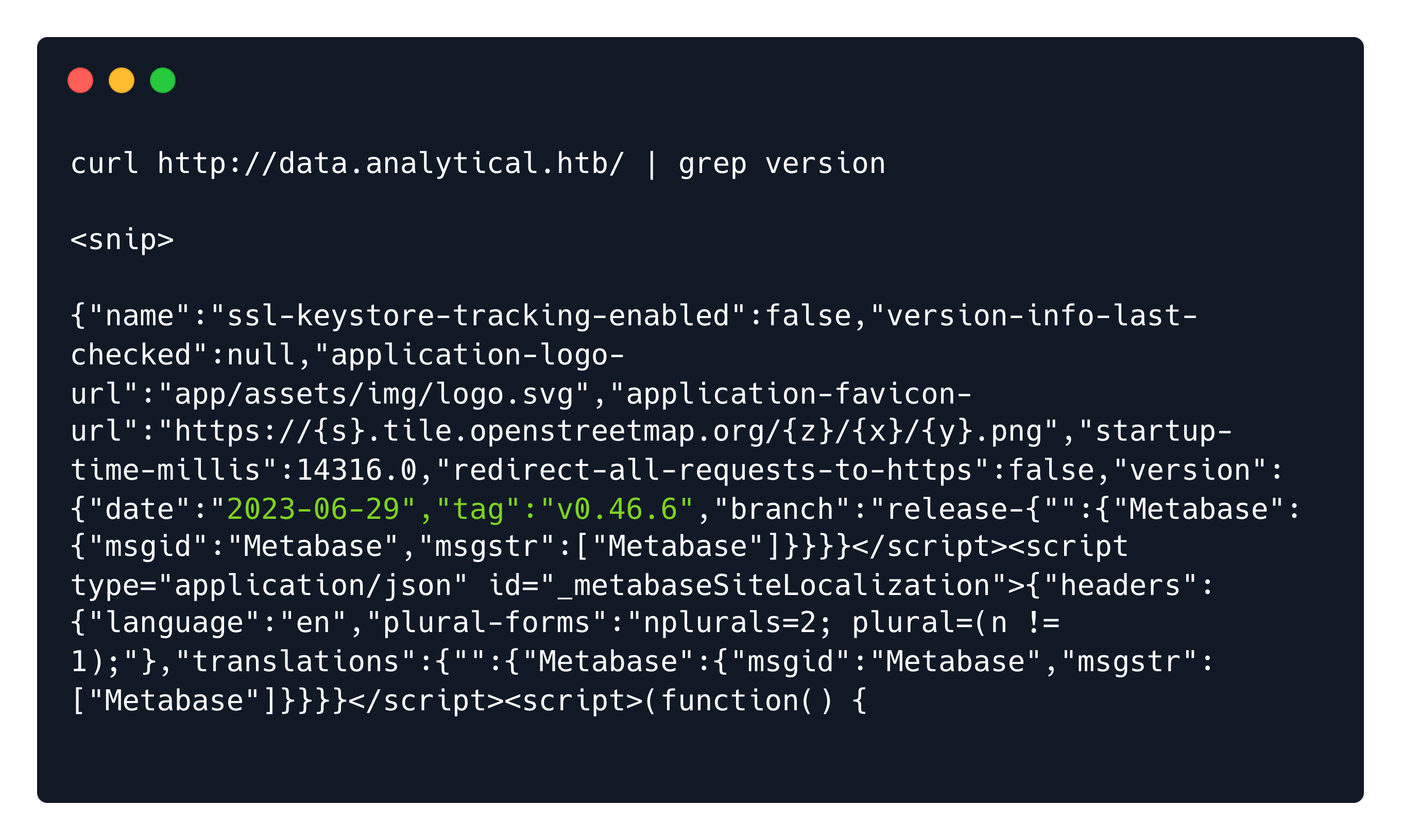 由於我們沒有登入 Metabase 實例的憑據,因此我們嘗試查看版本號,看看是否能找到任何漏洞。
