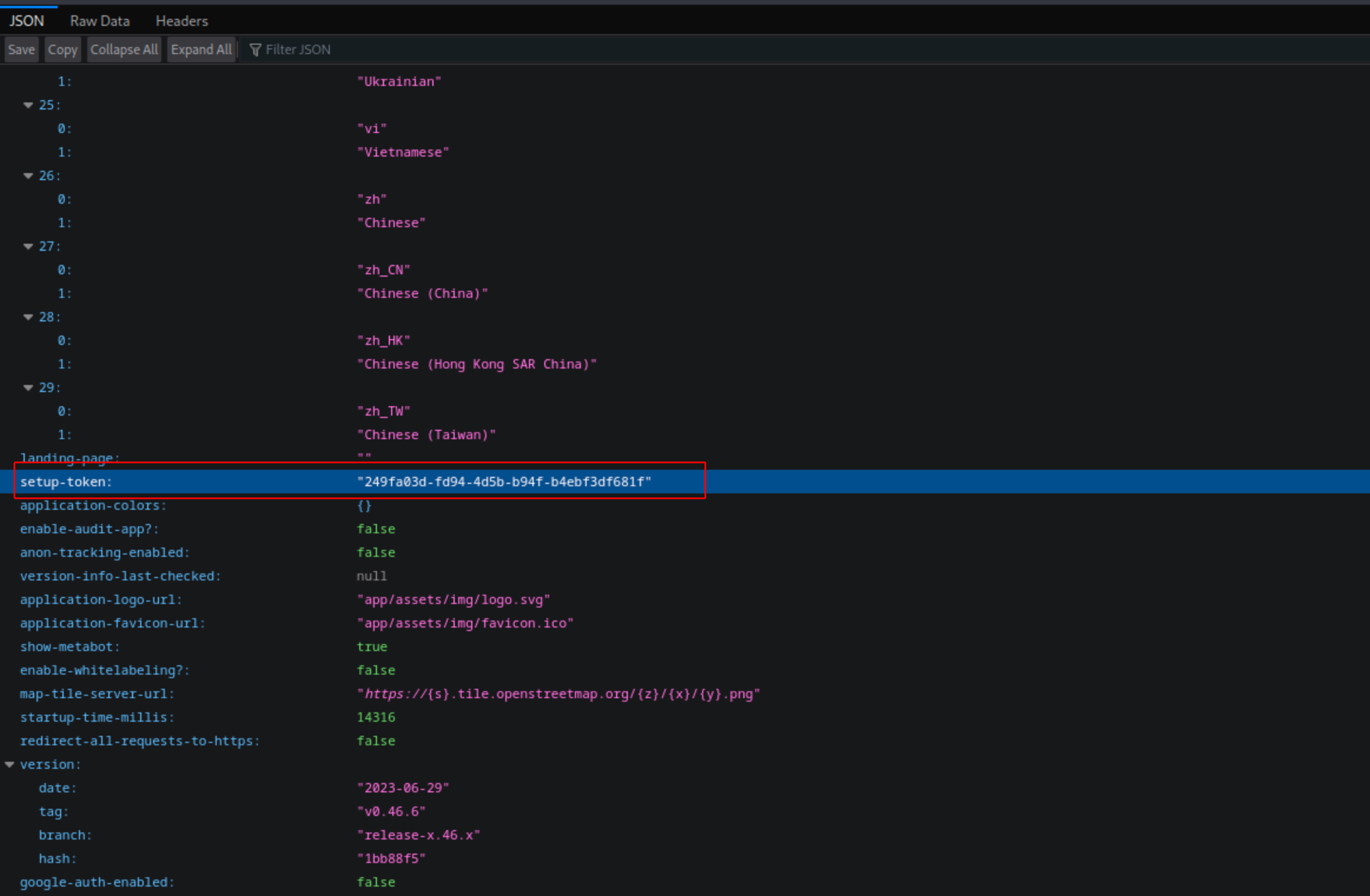 我們可以在/api/session/properties 端點存取並搜尋 setup-token 來找到此令牌。