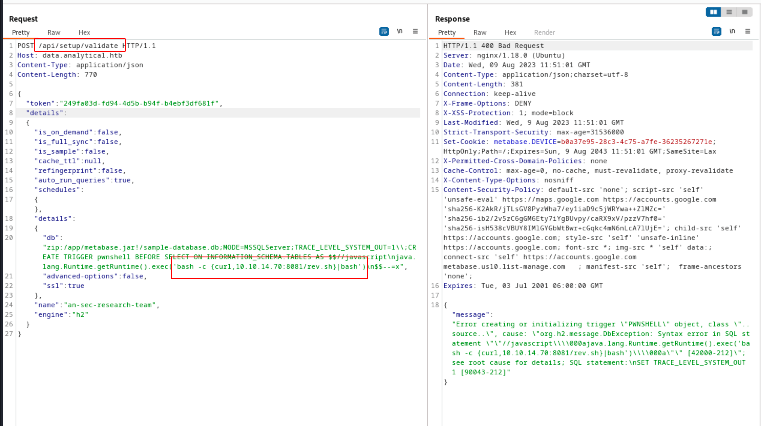 我們發現運行的 Metabase 版本是 v0.46.6。根據這個部落格文章指出,該版本容易受到預驗證遠程代碼執行漏洞 CVE-2023-38646的攻擊。這個漏洞之所以存在,是因為使用者可以存取一個名為 setup-token 的特殊令牌,其用於完成設定過程。即使設定完成後,令牌也仍然保持活動狀態,並可能被未經授權的使用者存取。 攻擊者可以利用這一點,通過向 /api/setup/validate 端點發送自訂化的 POST 請求來潛在地實現代碼執行。