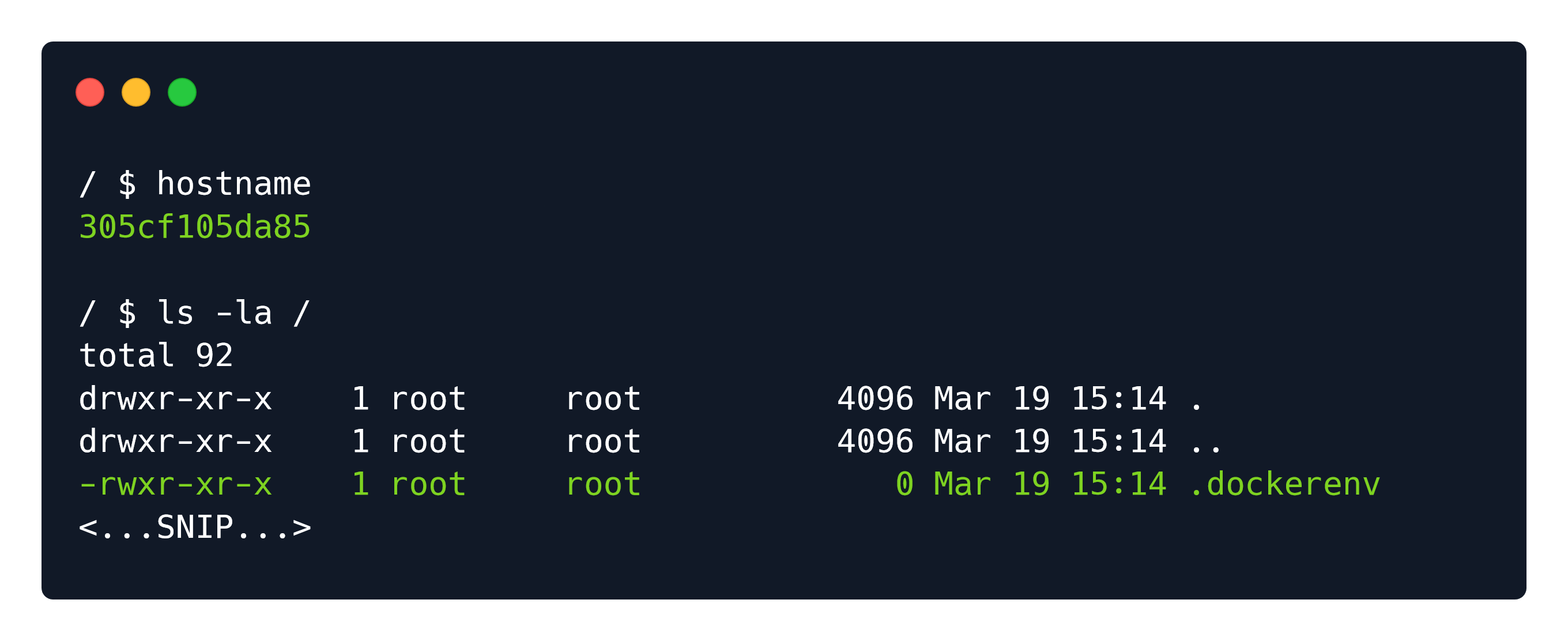 很快就會發現我們在一個 Docker 容器中,因為主機名和 / 中存在一個 .dockerenv 文件。