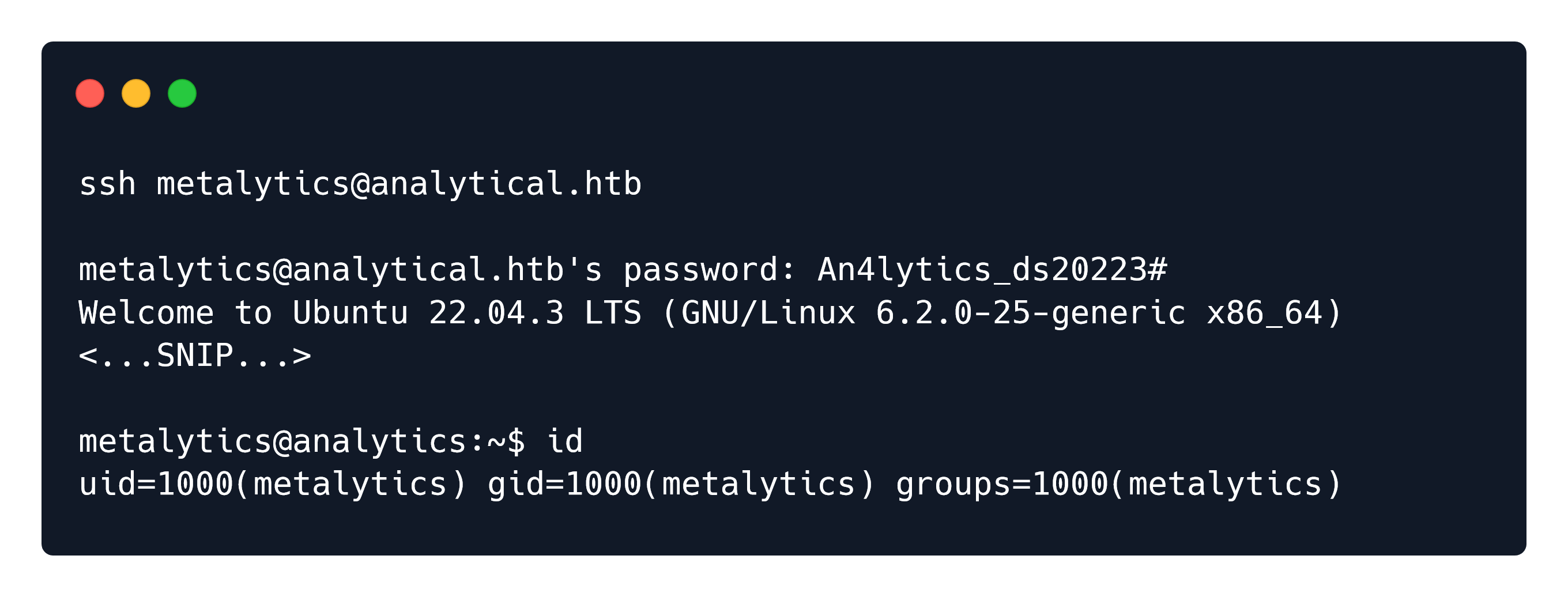 我們的嘗試成功了,因為我們已經在主機上驗證了 metalytics 用戶。用戶標誌可以在 /home/metalytics/user.txt 中找到。